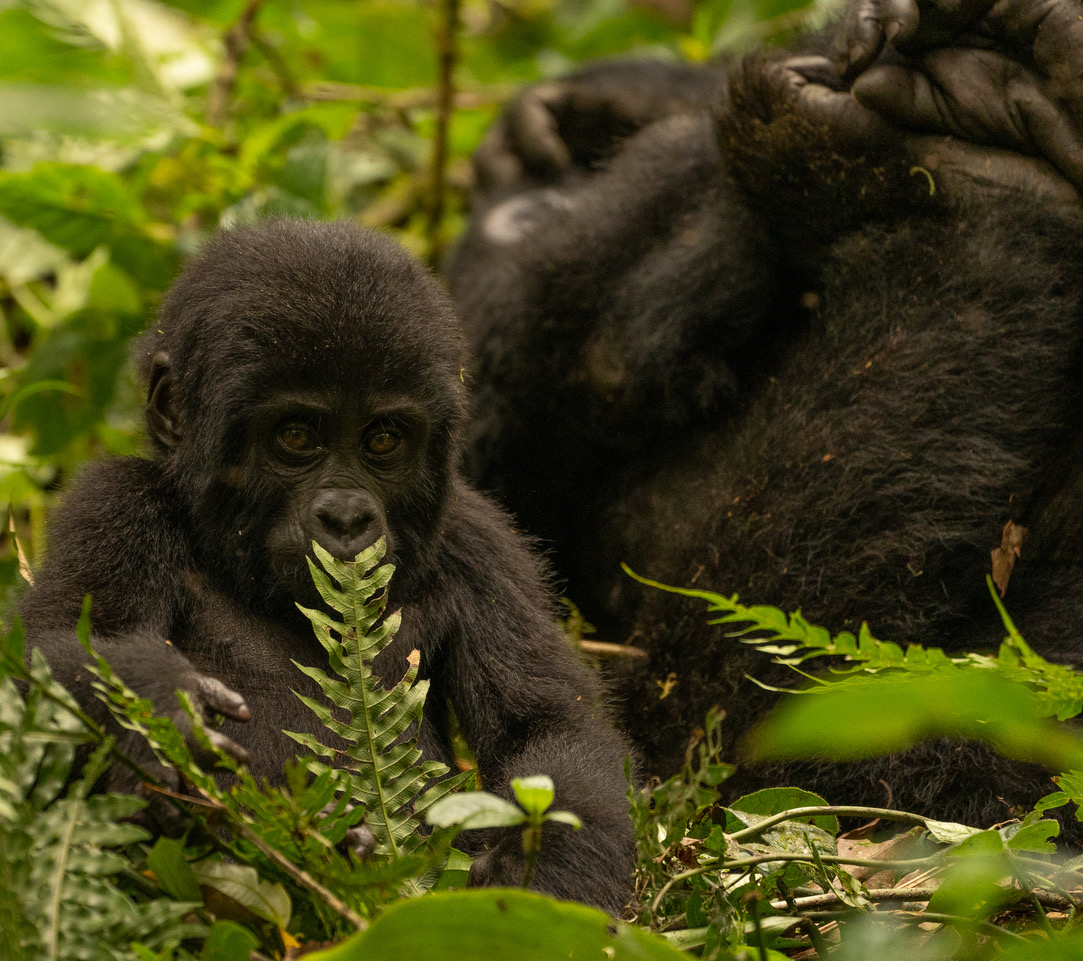 The day started like any other at Buhoma Lodge in the northern region of the Bwindi Impenetrable Forest with a few wisps of cloud cover, low hanging mist over the canopy tops and the sounds of the forest waking up. Our two groups had been assigned to two different gorilla families for our morning treks and both were set to start after a steep incline through the neighboring village. As we ascended, escorted by our AK47-wielding park rangers (for the group’s protection, mainly as a loud deterrent for elephants), the local children gathered to say hello and give us a wave of encouragement. Led by their trusted porters (some of whom had shoes held together by duct tape and others wearing nothing more than flip flops), each guest climbed further and further towards the top, stopping along the way to admire the views and catch our breath. Going at our own pace we made good headway until a young boy escorting a single cow overtook us on his way up the mountain to look for fresh grazing for his animal. When the groups neared the top, we split up and went in opposite directions, approaching the edge of the forest we would enter in search of our day’s prize—gorillas. The forests of Bwindi are surrounded by local villages and communities and their livestock and crops, which in this region is mainly tea. Tea plantations create a natural perimeter around the forest as gorillas do not like the taste of the leaves nor do they like to walk through the scraggly bushes. This leads to a dramatic landscape and change of vegetation as one steps from in amongst the tea bushes no higher than one’s waist into a forest with a canopy extending higher than four giraffes standing on each other’s shoulders (how’s that for a visual!).
