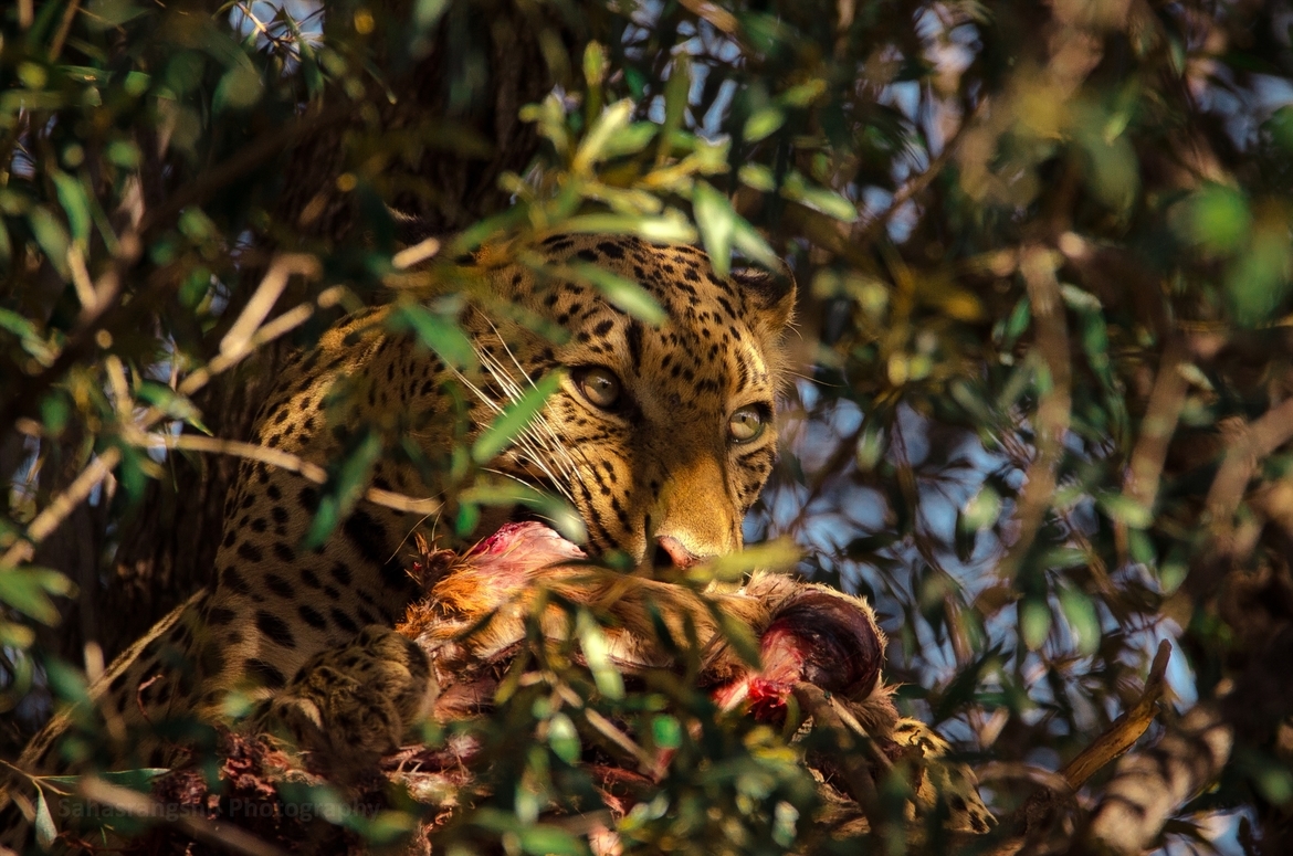 Photographer Sahasrangshu Choudhury captured the moment when a leopard, deep within the branches of a tree, devoured its prey.